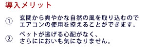 開閉することができるので出入りの邪魔にもならず、玄関を開けていても犬や猫が入ってくることもありません。電話から取り付けまでスムーズに対応して頂けました。 |